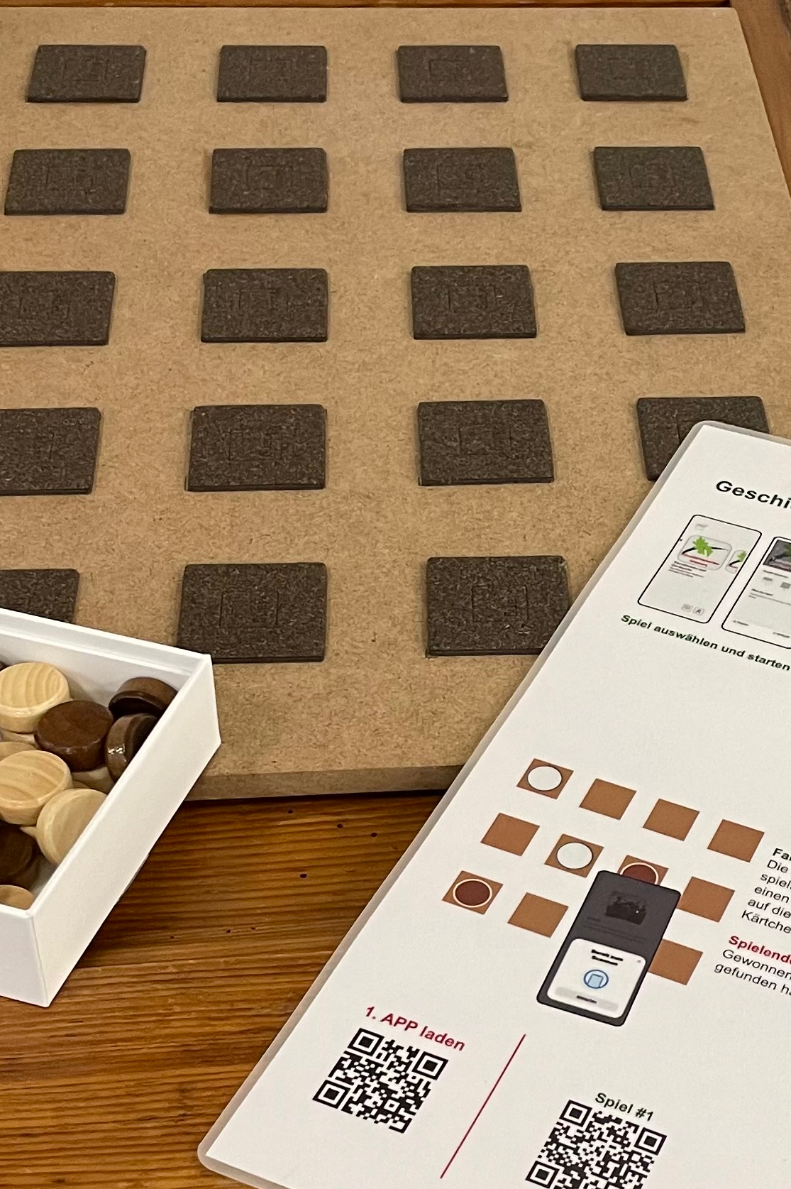 Es liegen zwei Geschichts-Memory Spielbretter auf, welche mit einem Smartphone gespielt werden können (mit Geräuschen und Tierstimmen).