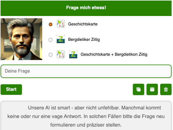von Konrad von Sellenbüren, einer Schlüsselfigur bei der Entstehung des modernen Bergdietikon. Konrad beantwortet alle Fragen aus seinem grossen Wissen über Bergdietikon. Antworten auf wiederholte Fragen, sind inhaltlich gleich, können aber unterschiedlich formuliert sein. Seine Antworten ändern sich inhaltlich nur, wenn sich sein Wissenshorizont verändert hat, das Datum seines Wissenshorizonts ist im Chat angegeben.