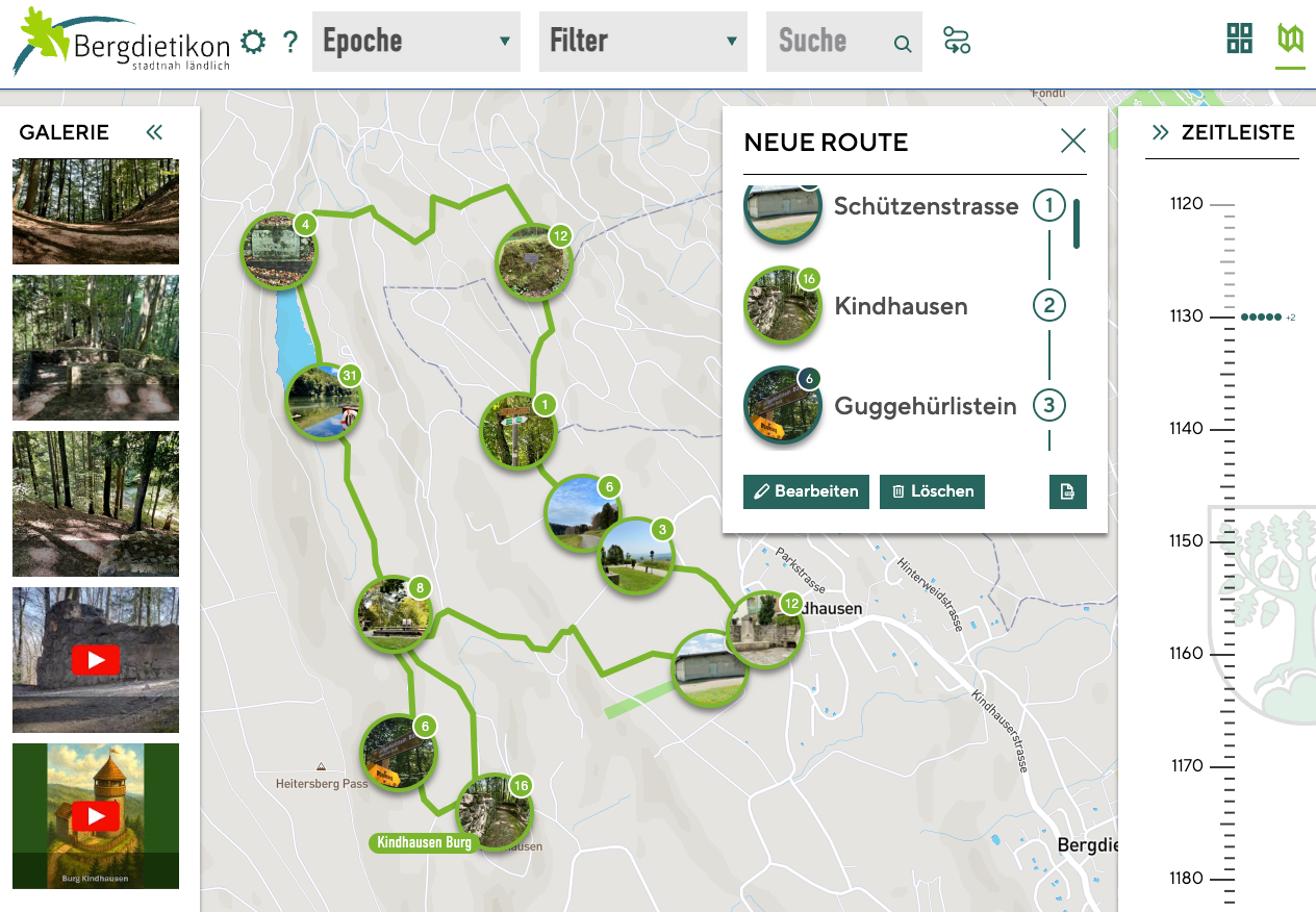 integrierter Routenplaner in der Geschichtskarte, ermöglicht es den Besucherinnen und Besuchern thematische Geschichtsrundgänge abrufen, ausdrucken und als Wander- oder Velokarten zu nutzen, um historische Orte gezielt aufzusuchen. Auch individuelle Routen lassen sich zusammenstellen und ausgeben.