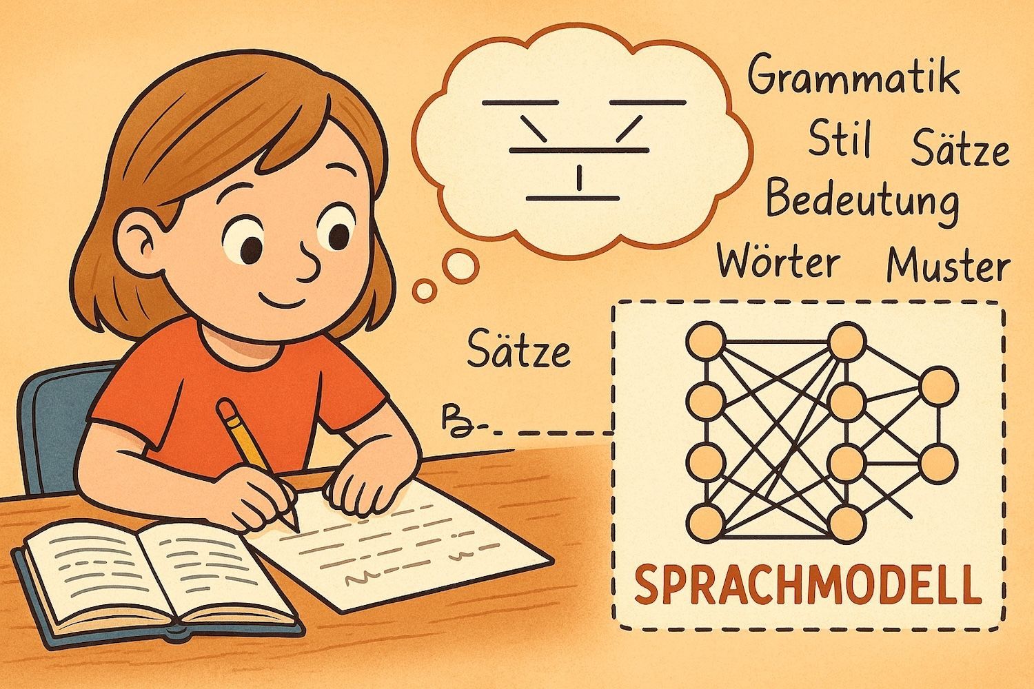 Ein Sprachmodell lässt sich am besten mit einem Kind vergleichen, das gerade lesen und schreiben lernt. Es erwirbt sein Sprach-Verständnis nicht durch auswendig gelernte Grammatikregeln, sondern indem es in vielen Beispielen erkennt, wie Sprache in der Praxis funktioniert. So entsteht nach und nach ein "inneres" Gefühl für Satzbau, Bedeutung und Zusammenhänge.
