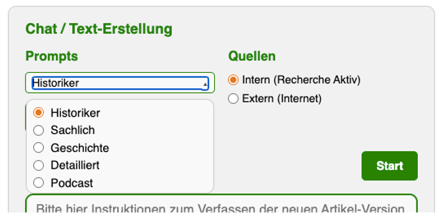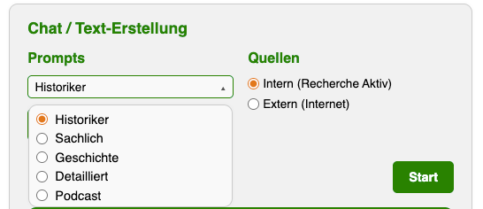 Die Prompts bestimmen, wie die Antwort im Chat strukturiert und formuliert wird. Es stehen fünf verschiede, vordefinierte Möglichkeiten zu Auswahl. Die Prompts steuern nur im Hintergrund. Es muss trotzdem eine entsprechende ausformulierte Frage eigegeben werden.
