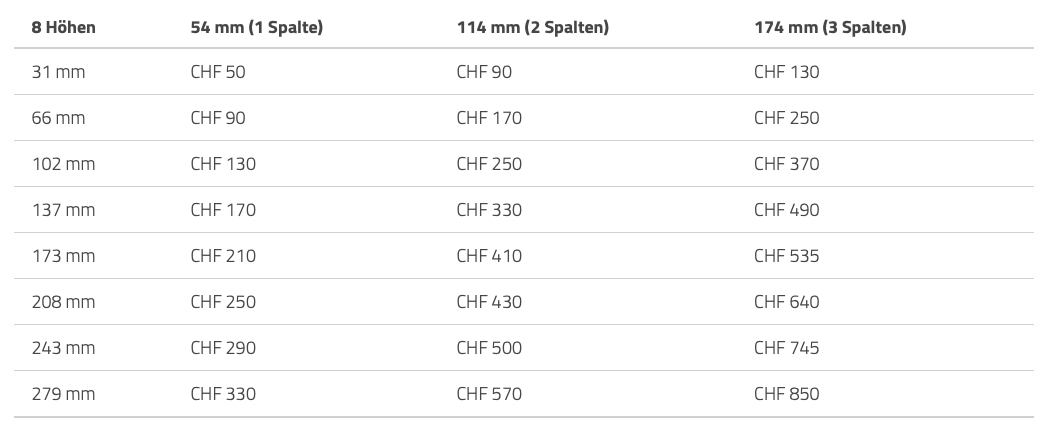 - grösseres Inserat neu gestalten: nach Aufwand (CHF 130 pro Stunde)