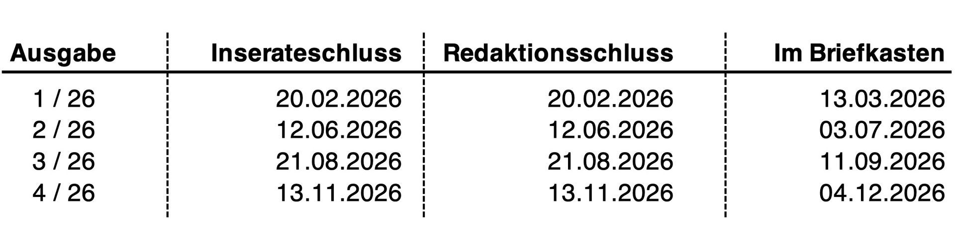 Bei mehrmaligem Erscheinen des gleichen Inserats in aufeinanderfolgenden Ausgaben profitieren Sie von folgenden Ermässigungen: 2-mal: 5 %; 3-mal: 10 %; 4-mal und mehr: 15 %. Die obigen Preise gelten für druckfertige Vorlagen (korrekte EPS-/AI- oder PDF-Datei mit eingebetteten Schriften, TIFF-/JPG-Datei oder kopierfähige Papierversion, CMYK-Farben oder Graustufen). Bei Fragen oder besonderen Formatwünschen rufen Sie uns bitte an.